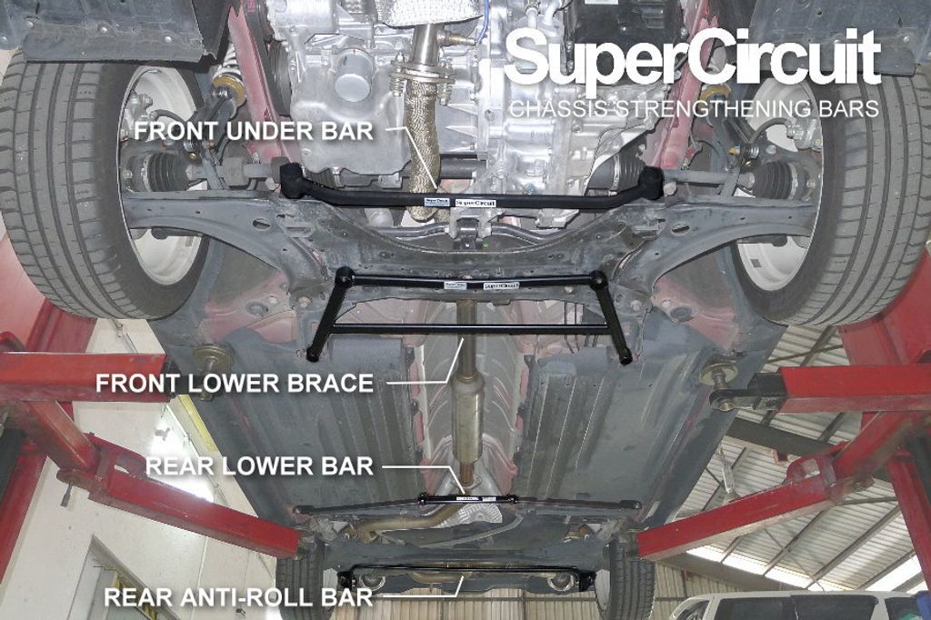 For optimum chassis strengthening, also install the SUPERCIRCUIT FRONT STRUT BAR, FRONT LOWER BRACE, REAR LOWER BAR and REAR ANTI-ROLL BAR specially developed for the Suzuki Swift Sport 1.4T Booster Jet (ZC33S).
